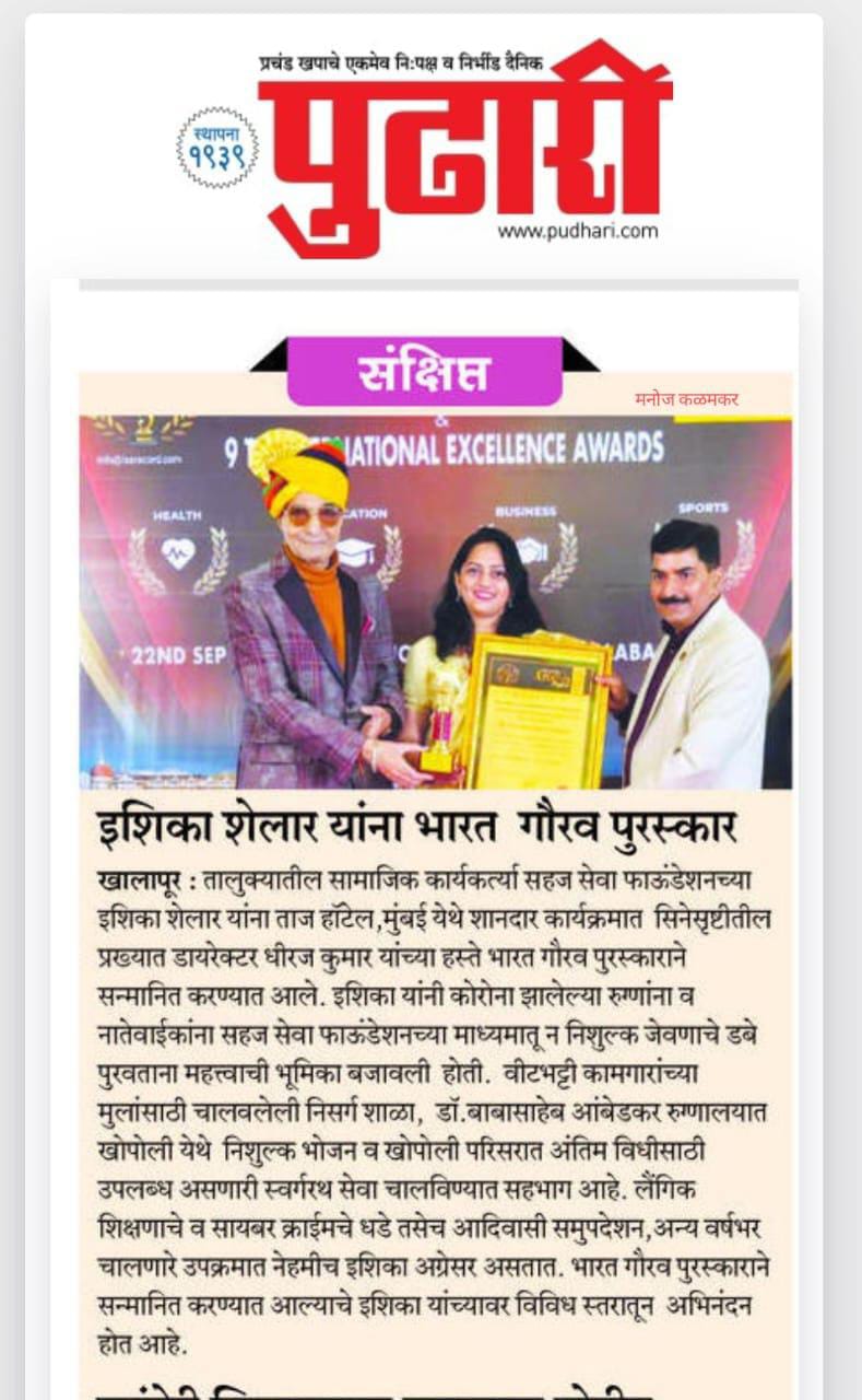 सौ.इशिका शेलार भारत गौरव पुरस्काराने सन्मानित.